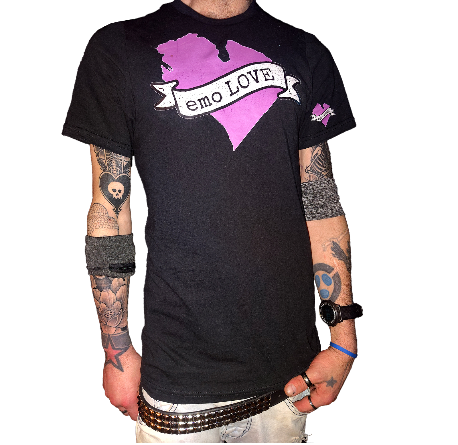 Show off your scene spirit with this bold black tee featuring a purple Michigan heart and banner reading “emo LOVE.” Perfect for anyone who wears their state pride and emotional depth on their sleeve—literally.